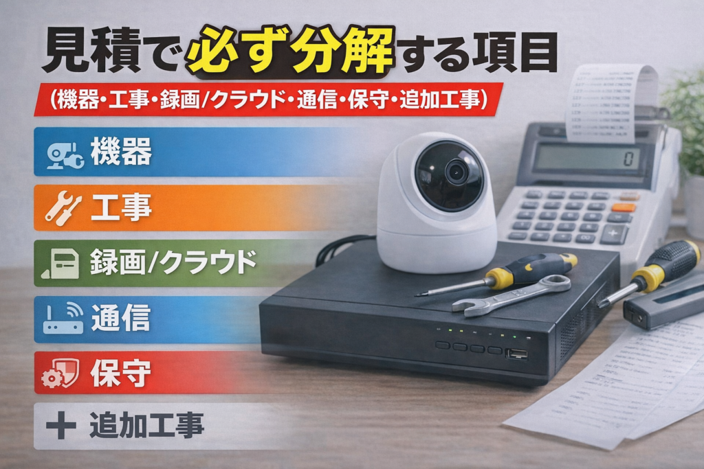 - 見積で必ず分解する項目(機器・工事・録画/クラウド・通信・保守・追加工事)